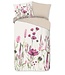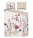 Het dekbedovertrek met rits aan de lange zijdes Hala heeft een prachtige print van veldbloemen opgebouwd uit de kleuren roze, mauve. paars en zachte groentintgen die prachtig tot hun recht komen op de zandkleurige ondergrond, waardoor het overtrek zowel in een modern als klassiek interieur heel goed tot zijn recht komt. De achterzijde van het overtrek is uitgevoerd in een effen zandkleur met een subtiele textielstructuur.