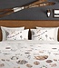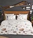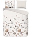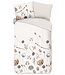 Het dekbedovertrek flanel Mirre van Goodmorning heeft een lichte basis met een print van verschillende takjes, katoen pluizen en dennenappels. De onderzijde van het overtrek is in een lichte zandkleur.