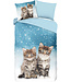 Altijd al een kitten willen hebben? Als jouw kind niet van te veel poespas houdt is dit lieve Goodmorning Kids Flanel Family dekbedovertrek een echte must-have. Op de voorzijde vind je twee lieve kittens in de sneeuw die je verwachtingsvol aankijken. Met deze twee schatten hoef jij niet bang te zijn voor muisjes op je slaapkamer. Het is een dubbelzijdig overtrek, de andere kant is effen blauw. En met het bijpassende dubbelzijdige kussensloop wissel je makkelijk af!